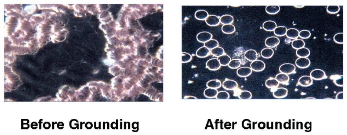 Grounding changes your blood viscosity (your red blood cells have a greater negative charge when grounded, so they will not clump and clot together)