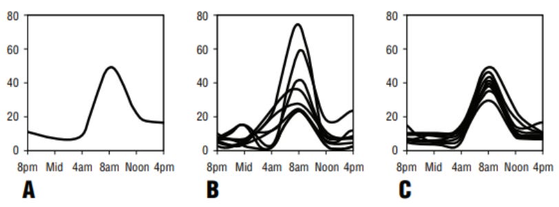 Graph A is what your cortisol should look like throughout the day. Graph B is a real sample from study participants. Graph C is what the study participates levels were after grounding.